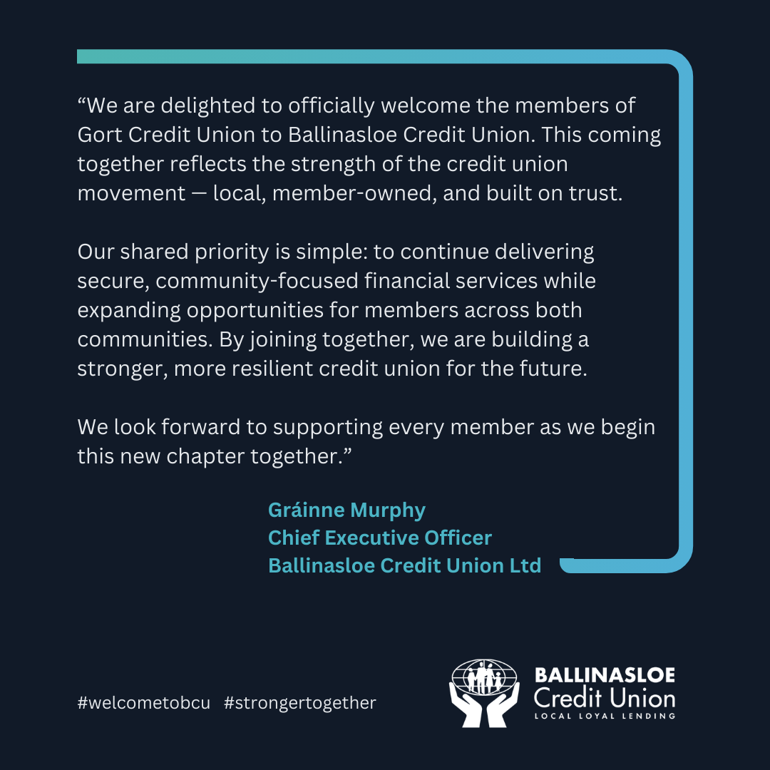 “We are delighted to officially welcome the members of Gort Credit Union to Ballinasloe Credit Union. This coming together reflects the strength of the credit union movement — local, member-owned, and built on trust. Our shared priority is simple: to